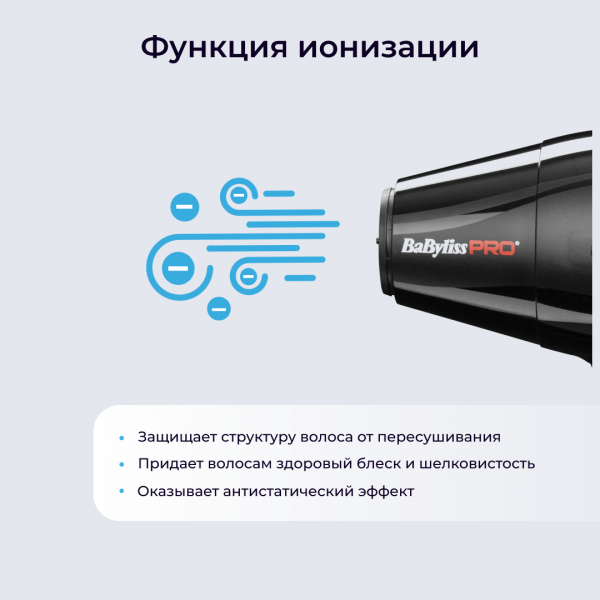 Генератор ионов производит отрицательно заряженные частицы, которые закрывают и разглаживают волосяные чешуйки, что делает волосы шелковистыми, сохраняет естественную влагу и снимает статическое напряжение.