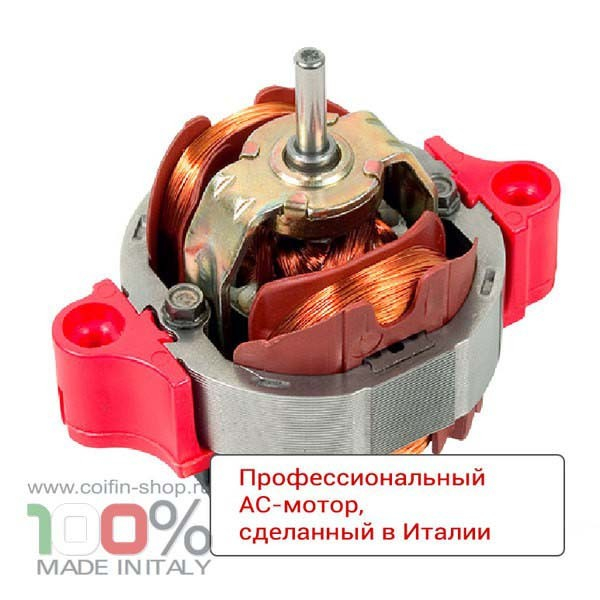 Мотор AC-типа изготовлен в Италии и обладает феноменальной износостойкостью несмотря на ежедневную многочасовую нагрузку в условиях салона или парикмахерской.
