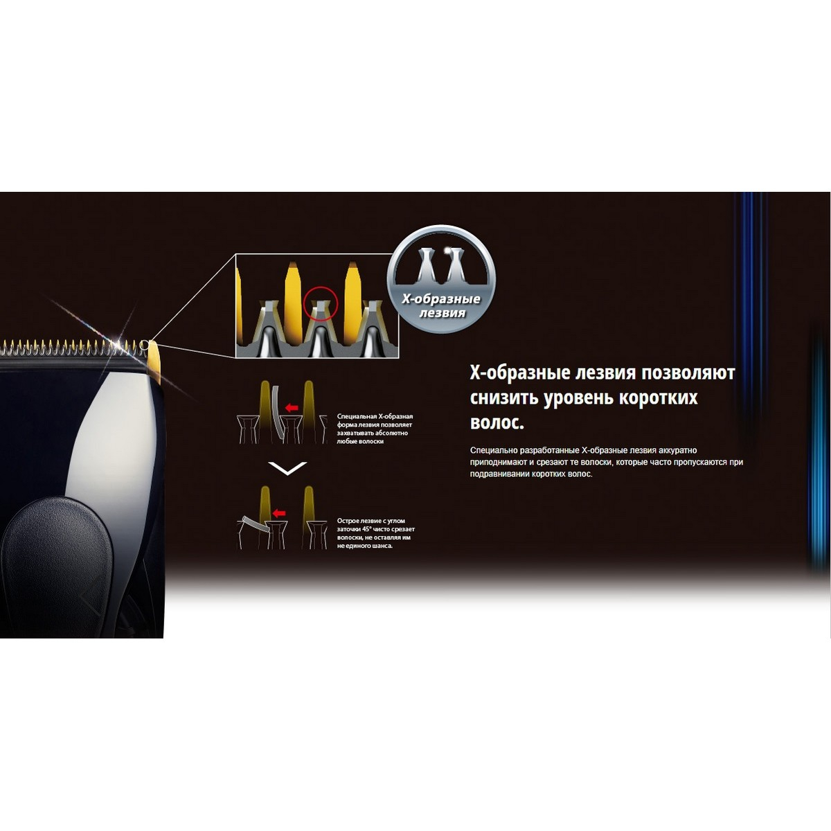 Уникальная Х-образная форма лезвий позволяет аккуратно приподнимать и срезать те волоски, которые часто пропускаются при подравнивании коротких волос, а угол заточки под углом 45 градусов обеспечивает точную, гладкую и эффективную стрижку.
