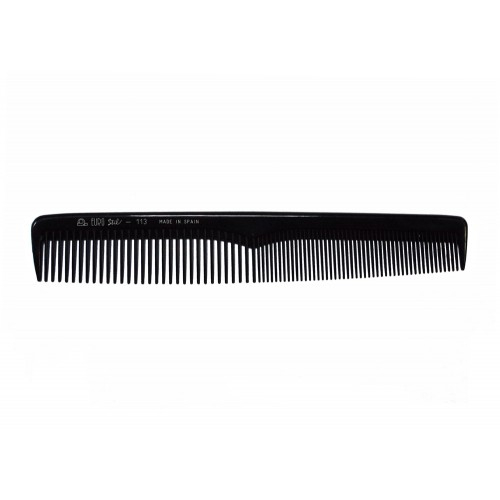 Расческа длиной 17.5 сантиметров, оснащена рядом зубцов разных размеров - тоненькие и более грубые, редко расположенные. Благодаря им расческа деликатно захватывает волосы, бережно их прочесывает и способствует аккуратному состриганию необходимой длины прядей. Тщательно отполированные зубчики бережно взаимодействуют с локонами и чувствительным эпидермисом, не травмируя их.