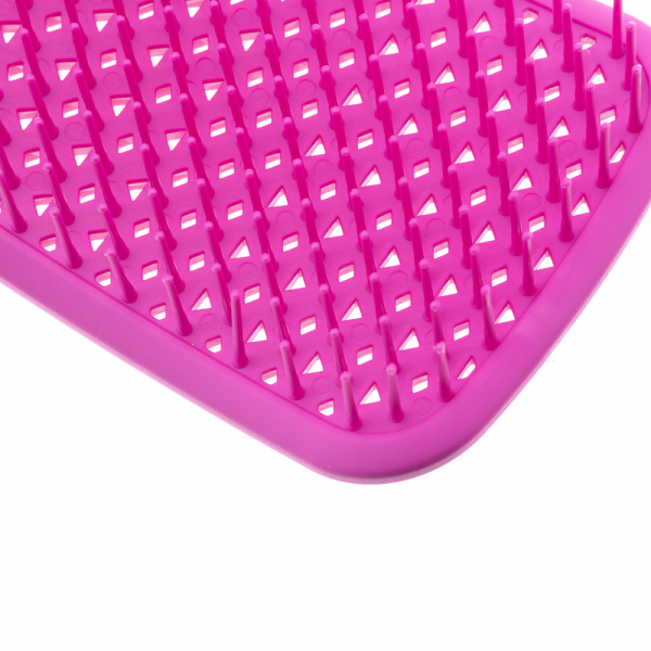 Укорочённая ручка с учётом анатомии запястья. Большим плюсом является ее целостность с основанием, нет швов, в которых волосы могут застревать во время расчесывания.