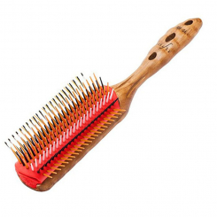 Деревянная щетка длиной 21.2 сантиметр отлично вытягивает волосы. 9 рядов зубцов по 22-25 щетинок разного цвета помогают ориентироваться при использовании различных техник укладки. Резиновое основание имеет повышенную устойчивость к теплу и влаге. Создает естественное натяжение и придает блеск.